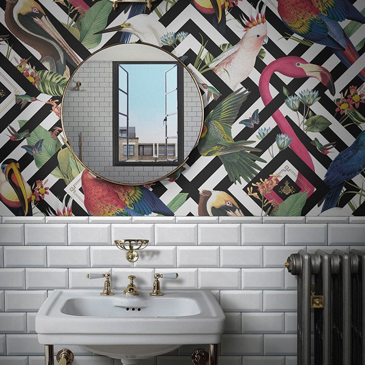 The cool-hued wallcovering from Schumacher turned this compact powder room into a true statement space. The striking ikat design is just one of several vibrant patterns featured throughout a lively Salt Lake City residence created by Hillary Taylor, founder and principal of Hillary Taylor Interiors.