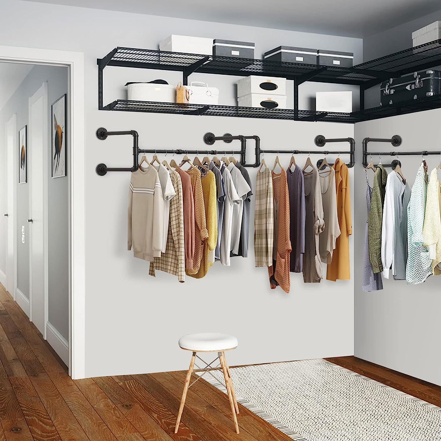 For example, blogger Liz Marie transformed a plain, unused wall into a polished clothing storage area with a clean industrial vibe. She installed two unevenly spaced sections of galvanized piping to serve as hanging rods, giving the setup a visually interesting, layered look while maximizing storage. To complement the design and keep accessories organized, she crafted a row of sturdy hooks for her hat collection using oversized carriage bolts, adding both practicality and a distinctive, handcrafted touch to the overall space.