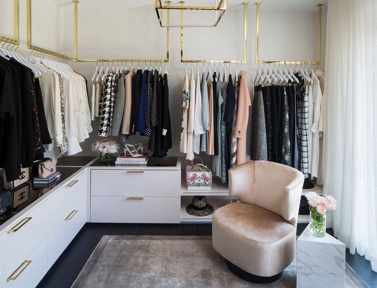 Use your limited closet space as a chance to design a boutique-inspired area with open shelves that beautifully display your clothing. Complete the look by adding a crystal chandelier for a glamorous touch, similar to this all-white open closet designed by Leanne Ford Interiors.